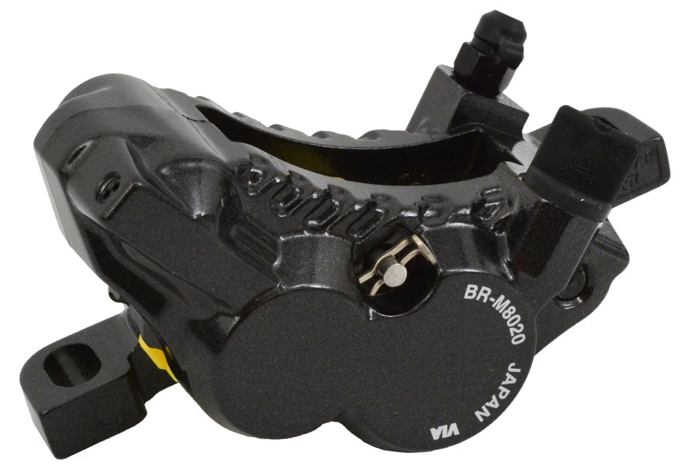 Der hydraulische 4-Kolben-Bremssattel Shimano XT BR-M8020 für Vorderrad oder Hinterrad mit Post-Mount Aufnahme und H03C Metal Disc Beläge.